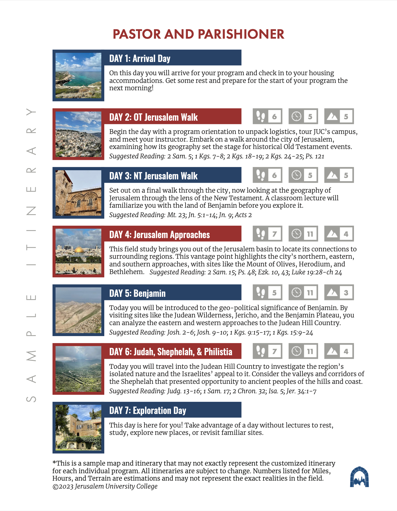 Tim has first-hand experience with Jerusalem University College. His first trip to the Holy Land was with JUC. In 2007, Tim completed a three-week course called the Geographical and Historical Setting of the Bible. That trip included a three-day extension into neighboring Jordan. Our 2025 trip (the Pastor-Parishioner Study Program) is a shorter version of the course Tim took.